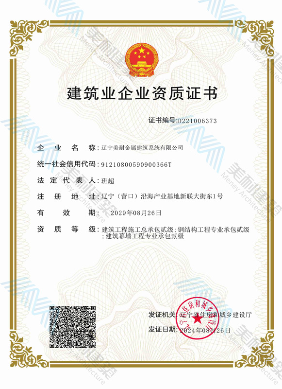 遼寧美耐金屬建筑系統(tǒng)有限公司位于遼寧(營口)沿海產(chǎn)業(yè)基地,專注于預(yù)制金屬建筑系統(tǒng)領(lǐng)域,是一家集工業(yè)建筑設(shè)計(jì)、制作、施工及相關(guān)的技術(shù)咨詢與服務(wù)為一體的綜合性服務(wù)企業(yè)。作為國家鋼結(jié)構(gòu)協(xié)會會員、中國建筑金屬結(jié)構(gòu)協(xié)會會員單位與國家高新技術(shù)企業(yè),美耐建筑集建筑工程施工總承包、鋼結(jié)構(gòu)工程專業(yè)承包等多種資質(zhì)于一身,并擁有22項(xiàng)鋼結(jié)構(gòu)建筑領(lǐng)域?qū)@?項(xiàng)軟件著作權(quán)。